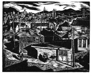 In 1934, during the recovery of the Great Depression, President Roosevelt created the WPA program to put people back to work. It was successful in the sense that roads, bridges, and buildings were built. For Cindy’s father, even more important was being hired for the WPA to create art for libraries, such as a mural that was done in Indiana, and propaganda and scenic art block prints that were distributed to 50 libraries throughout the country. The program allowed 50 prints off of each block for distribution, and then the blocks were destroyed so the artist would not be able to profit beyond for what he was paid. Until 1968, no blocks were known to have survived. This block was destroyed. This print is one of a kind par from the ones held in museums listed. (please see historical link list on Charlies life page.)
